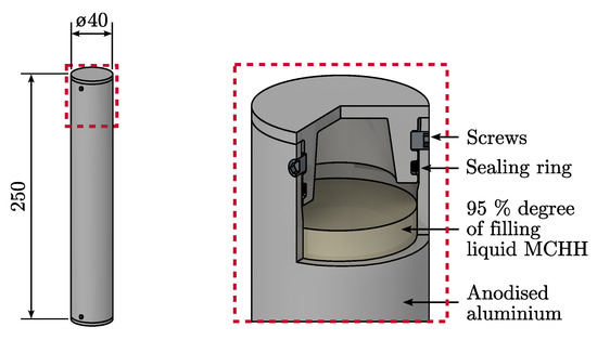 Seamless aluminium pipes were selected as base materials for the capsules, since they show good accessibility for the chosen corrosion protection and applicability of the sealing concept. A detailed view of the final encapsulation concept is depicted in Figure 6. The pipes have a wall thickness of 3 , an outer diameter of 40 and the overall capsule length is 250 . The PCM occupies in its liquid state 95% of the capsule volume which corresponds to a volume of . The total mass of the PCM capsule is 554 , whereby 281 are from the PCM. A single macro-capsule can store 47 of thermal energy when latent heat is considered as the only energy storage mechanism and sensible heat of the capsule shell and the PCM is neglected. Referred to the capsule outer volume the storage density is 150 /.