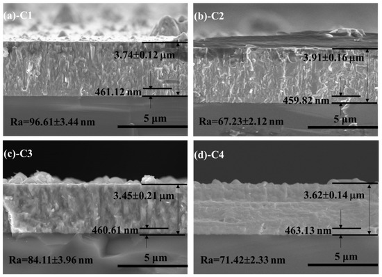 Cross-section morphology, thickness and surface roughness of all CrN films on Si (100) wafers: (a) C1; (b) C2; (c) C3; (d) C4.
