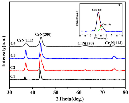 Figure 2 shows the XRD patterns of four film samples. The main peaks exhibit a broadening trend along with the enhancement of bias voltage and the C4 sample presents the most apparently broadening phenomenon, indicating a decrease of grain size. In addition, the phase structure of films reveals an obvious change: CrN (C1) → CrN + Cr + Cr2N (C2) → CrN + Cr2N (C3), and the preferred orientation of CrN also change significantly. The negative bias voltage applied on the substrate during arc ion plating (AIP) process will exert a kinetic effect on the nucleation and growth stages of film, and then transform the microstructure and whole performances of film [22,23]. Hence, the deposition bias voltage will present a significant impact on the microstructure of film. When the bias voltage is −20 V, the CrN (111) and CrN (200) are sharp. Additionally, CrN (200) is the dominant growth direction. Nevertheless, the Cr phase is detected when the bias voltage increases to −50 V. Since the Cr (110) and CrN (200) of the C2 specimen are partially overlapped, the fitting peak of the overlapping region is shown in the top left of Figure 2. Meanwhile, the Cr (110) is vanished in the C3 sample, and the Cr2N (113) phase is found in the C2, C3 and C4 specimens. Some research [1,13,24] has pointed out that the Cr2N phase exhibited a better corrosion resistance in the NaCl solution than in the CrN phase. Thus, the phase structure is a key factor to measure the protective ability of film [25].
