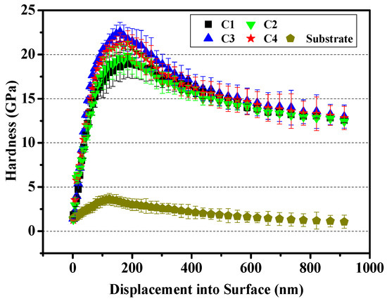 Hardness (H) and Elastic modulus (E) are two important parameters to inspect the mechanical properties of film. Generally, the enhancement of deposition bias voltage will improve the hardness and internal stress of film. The study result showed that the relationship between H and E of solid material depended on the energy dissipation capacity of material itself [30]. The smaller the ratio of H/E is, the smaller the elastic recovery of indenter becomes. Thus, the ratio of H/E can be more intuitive to reflect the toughness of film. Meanwhile, the H3/E2 value is a key parameter to measure the wear resistance of film, and a high H3/E2 ratio implies a strong ability of film to resist the crack propagation under external force [31]. The hardness, H/E and H3/E2 of substrate and CrN films are shown in Figure 3 and Table 3. It is clear that the hardness, H/E and H3/E2 of 316L substrate are about 6.9 GPa, 0.038 and 0.010 GPa, respectively, which are lower than CrN-coated samples. Among all CrN films, with the bias voltage increases from −20 to −80 V, the hardness, H/E and H3/E2 of CrN film show an ascend trend, which increase by 18.75%, 23.44% and 52.17%, respectively. In addition, the C4 specimen under alternating bias design of −20~−80 V presents a desirable hardness and toughness.