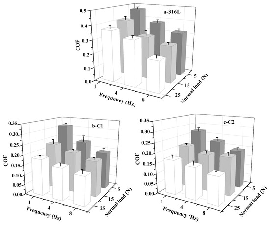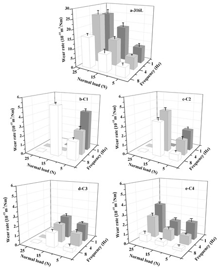 In order to understand the protective behavior and failure mechanism of as-prepared films in actual working conditions, the tribological behaviors must be discussed under the specific experimental environment and parameter setting. The friction pair, relative motion form, applied load and relative velocity are the influence factor of tribological behaviors [29]. Before discussion, we consider that the relative low hardness of WC counterpart displays a weak effect on friction and wear behaviors due to the small gap between the hardness of as-prepared CrN films. The COF and wear rate of substrate and all specimens are shown in Figure 7 and Figure 8. Since some specimens fail under certain conditions, the wear data of these experimental points cannot be calculated after wear testing. It is significant that the COFs of 316L substrate and CrN films show various characters under different friction conditions. The maximum value of 316L substrate (0.47) is found at the 5 N/1 Hz experimental point. The minimum value of C4 sample (0.11) appears at the 25 N/8 Hz experimental point. Nevertheless, the COFs under different applied loads and frequencies exert a good regularity. As a whole, the COF of these samples decreases with the increase of the slip velocity, and the COF at the low load point is higher than that at the high load point. However, the wear rate demonstrates a different change trend. The wear rate decreases with the increase of slip velocity, while the wear rate at the low load point is lower than that at the high load point. In this paper, the friction and wear behaviors of films are analyzed by lubrication medium of seawater, Hertzian contact stress, micro-bulge contact state and plastic deformation rate of film during running-in stage. Compared to pure water, some frictional chemical products with sludge-like compositions exhibit a certain degree of lubricating effect on the contact surfaces [37,38]. However, the corrosion in seawater cannot be neglected. Seawater can penetrate into the crack of friction zone, and the cracks are easy to expand under the action of friction and hydraulic pressure. On the one hand, it can accelerate the stripping of film. On the other hand, some localized electrochemical corrosion may occur in these cracks and then accelerate the film failure.