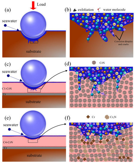In the meantime, the wear contours of demarcation point on substrate and CrN films are shown in Figure 10. For substrate and C4 film, the wear depth at 25 N/8 Hz is 15 and 2 μm, respectively, which is higher than that at 15 N/8 Hz. At the condition of 15 N/8 Hz, the depth of wear track on 316L substrate reaches to 7 μm, which is greatly higher than CrN-coated specimens. In detail, the wear depth of C1, C2, C3 and C4 samples is about 3.5, 3.1, 2.2 and 1.1 μm, respectively, which is 50.00%, 55.71%, 68.57% and 84.28% lower than that of substrate, respectively. Clearly, due to the design of alternating bias, the C4 specimen demonstrates the lowest depth and the best anti-bearing capacity, which are well in agreement with the results of the wear rate. Through the above analysis, the detailed schematic diagrams of substrate, single and multilayer CrN films are listed in Figure 11. Since the monolayer film exhibits a similar behavior, the C1 sample is chosen as a representative for analysis. For the 316L substrate, some peelings and corrosion dimples are preferentially formed on the wear track due to a lack of effectively protect film, low hardness and poor toughness (Figure 11a,b). During friction and wear tests, some passive films may be formed on the surface of the substrate. Nevertheless, the passive film may easily be destroyed through reciprocal sliding, which leads to the exposure of fresh surface in corrosive solution and then increasing wear-loss. For the C1 specimen, some micro-cracks are observed on the contact interface, which more easily form the penetrative channels under high load and high frequency (Figure 11c,d). These channels will promote the permeation of water molecule and some ions (Cl−, Na+, H+, etc.) through micro-cracks. Concurrently, the high concentration of Cl- ions can easily strip the surface oxide, resulting in the exposure of new surface to seawater. Besides, seawater can stimulate the new surface and then aggravate the wear, inducing more corrosion channels and forming a vicious cycle. Finally, the corrosion and wear loss are aggravated. Importantly, some slight micro-cracks and micro-holes are inevitably formed under extreme conditions, although the C4 sample possesses an excellent comprehensive performance (Figure 11e,f). However, sophisticated intergranular boundaries are formed by laddered changing bias design, which can effectively inhibit the growth of micro-cracks and micro-holes, and then the corrosion channels are preventable. Thus, the C4 specimen emerges with the best corrosion and tribological performances in seawater.