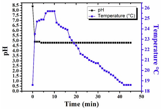 To understand influence of temperature and pH conditions on the synthetic process, the pH- and time-dependence graph plotted against the temperature for the first 45 min is presented in Figure 1. The figure shows a constant pH of 4.8 after 4 min of reaction time, providing ideal pH conditions for oligomer formation. The pH of the aniline dispersed in ethanol immediately dropped from 8.4 to 4.8 after the addition of APS in 0.13 M HCl solution. The temperature of the reaction medium simultaneously increased from 18.6 to 25.7 °C, showing that an exothermic reaction between neutral aniline molecules and APS occurred to produce aniline oligomers [13]. The continuous drop in temperature after 10 min shows that the reaction took place only for a short period of time. Since a low concentration of APS was used, it was completely consumed by the excess neutral aniline present in the reaction medium within a short period. The pH of the reaction medium greater than 3.5, along with the evidence of the exothermic reaction, showed that the reaction proceeded via oligomer formation.