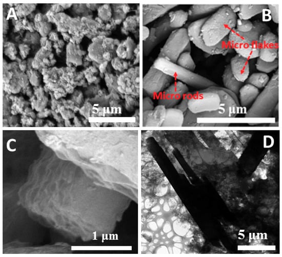 The SEM (FEI, Hillsboro, OR, USA) images of the aniline oligomeric structures in the presence of water (Figure 2A) and ethanol (Figure 2B) presented in Figure 2 showed shapeless agglomerates for the polymerization conducted in water, and well-dispersed microstructures, consisting of micro flakes and micro rods, for the reaction performed in ethanol. The TEM images (Figure 2C) show that the micro flakes were formed by the parallel alignment of several individual micro sheets. Figure 2D suggests that the micro sheets were rolled up to form the micro rods. The shapeless aggregates formed in water were similar to the aggregates previously reported by Konyushenko et al., which were synthesized using 200 mM aniline and 25 mM APS in 0.40 M acetic acid medium [13]. However, the microstructures formed in ethanol showed significantly different morphology to the previously reported nanoflakes synthesized by Zujovic et al. [27] in the presence of 24 mM aniline and APS in 4 mM HCl solution.