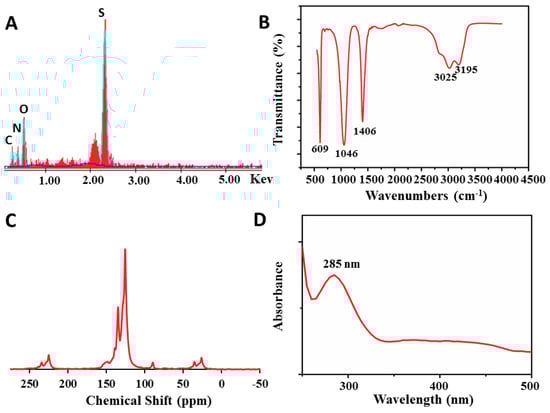 (A) energy-dispersive X-ray (EDX), (B) Fourier-transform infrared (FTIR), (C) 13C solid-state NMR, and (D) ultraviolet–visible (UV–Vis) spectra of sulfonated polyaniline (PANI).