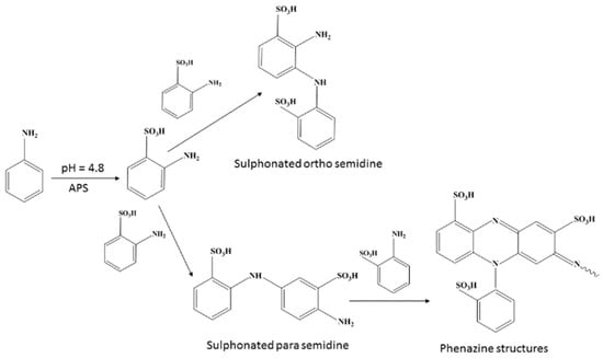 Based on the mechanism suggested by Kriz et al. [51] and Stejskal et al. [14] for aniline oligomers, the mechanism for the formation of SAO with phenazine structures is presented in Scheme 1. Initially, both sulfonated ortho-semidine and sulfonated para-semidine are formed. The sulfonated para-semidines then further react with sulfonated aniline molecules to produce planar sulfonated phenazine containing oligomeric structures.