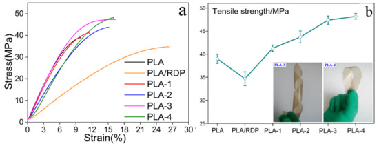 The typical stress-strain curves for the nanocomposite films are shown in Figure 3a. The linear stress-strain behavior of films in the initial region was observed as the ‘Hookean’ region, which was due to the changes in bond angles and spacing of PLA [34]. The rest of the region was considered as the plastic region, which is attributed to the movement of the PLA chain under the external force. The related data of tensile strength from the stress-strain curve, is illustrated in Figure 3b. It is well known that PLA is a rigid thermoplastic polymer with 38.5 MPa of tensile strength; however, the tensile strength of PLA/RDP film is only 34.7 MPa, which may be ascribed to the fact that the RDP molecules inserts PLA chains and increases the spacing of PLA chains, weakening the inter-chain stress during the blending process, resulting in reduced tensile strength [35]. The nanocomposite films show a trend of increase in tensile strength, for example, when the content of ZIF-8@GO was 1.2 wt%, the tensile strength of PLA-3 was 47.4 MPa, which was an increase of 22.8% compared with the pure PLA. This may be owing to the fact that the added ZIF-8@GO particles played a reinforcing effect for PLA, where the Zn-containing groups of ZIF-8@GO could interact with the ester groups of PLA to form a partial crosslinking through coordination interaction, as exhibited in Figure 4a. In Figure 4a, the Zn-containing groups of ZIF-8@GO have open sites, as described in Reference [36], which have a strong coordination effect with C=O and C–O–C of ester groups in PLA. To support this conclusion, the FTIR curves of PLA and PLA-4 as a representative are exhibited in Figure 4b. The peak at 1761 cm−1 was attributed to the stretching vibration of C=O in PLA [8]. While adding ZIF-8@GO, the peak shifted to 1756 cm−1 for PLA-4. Similarly, the peak at 1091 cm−1, corresponding to the C–O–C vibration in PLA shifts the lower wavenumber. The shifts of these peaks could be due to the strong interaction between PLA and ZIF-8@GO. Moreover, RDP, as a compatibility agent, promotes the uniform distribution of ZIF-8@GO in PLA, which is beneficial to the improvement of mechanical properties [37,38]. The digital photo for the PLA films in Figure 3b, shows that the prepared nanocomposite films are so flexible, which could be due to plasticity of RDP for PLA, as well as the toughing effects of ZIF-8@GO in PLA [39]. The elongations at break of PLA-1, PLA-2, and PLA-3 are about 11.48%, 15.17%, and 16.33%, respectively, compared with 9.92% for PLA.