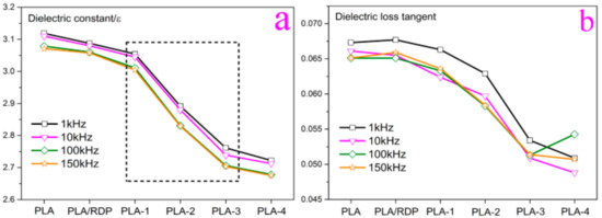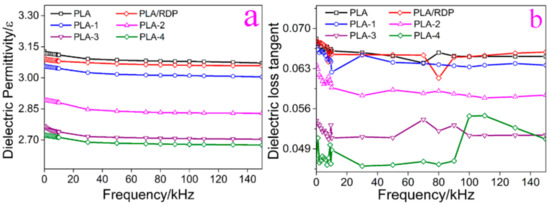 The dielectric constant and dielectric loss tangent are the most important parameters for dielectric materials. The dielectric constant and dielectric loss tangent of the nanocomposite films from 1 kHz to 150 kHz have been tested, and the results are shown in Figure 7. As shown in Figure 7a, the dielectric constant show low-frequency dependence within the measuring frequency. When the frequency is less than 30 kHz, the dielectric constant decreases rapidly with the frequency. This is because the dielectric constant of the PLA films, depends on their abilities to polarize at a given frequency. There are four possible polarizations that could contribute to the dielectric behavior: Electronic, ionic, dipolar, and interfacial polarization [44]. At low frequencies, all four types of polarization have enough time to occur, which is helpful to reduce the dielectric constant. As the frequency increases, the contributions of interfacial, dipolar, and ionic polarizations do not have enough time to adjust to the change of frequency and become ineffective, only the electronic polarization still plays a role in the dielectric constant [8,45]. The decrease of dielectric permittivity with increasing frequency is due to the relaxation behaviors [46]. Figure 7b shows the dielectric loss tangent for the films from 1 kHz to 150 kHz. In the range of the discussed frequency, the change of dielectric loss is not obvious. It is seen that the values of all the films are in a range from 0.045 to 0.070.