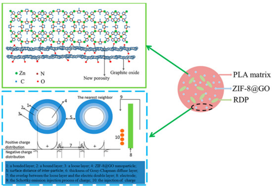 The effects of ZIF-8@GO and RDP on the dielectric properties of the nanocomposites are shown in Figure 8. While only adding RDP, the dielectric constant decreases slightly compared with the pure PLA, which may be ascribed to the presence of several benzene rings in RDP, because it is well-known that the benzene ring has a very low dipole moment; for example, the dielectric constant of polystyrene is about 2.4 at 103 kHz [47,48]. With addition of ZIF-8@GO, the dielectric constant had a rapid decline and achieved the lowest value at 1.5 wt% of ZIF-8@GO. For example, the dielectric constant of PLA-4 reached 2.61, compared with 3.1 for pure PLA at 10 kHz. The decrease of the dielectric constant is attributed to the good dispersion of fillers [49], nanoparticle effect of ZIF-8@GO, as well as the interface effect [46], as shown in Figure 9. ZIF-8 with a nano porous structure increased the porosity density in the PLA matrix, thereby reducing the polarization molecular density [50]. GO, with the special two-dimensional planar structure, lessened the efficiency of molecular piling and increased the free volume of the PLA, thereby diluting the density of polarized molecules in the PLA matrix [51]. The presence of GO also created a significant enhancement in porosity, owing to the formation of new pores at the interface of GO and ZIF-8 particles, as exhibited in Figure 9 [52]. Furthermore, as shown in Figure 9, the PLA molecules and the ZIF-8@GO nanoparticles in both the first layer and the second layer of the interface multi-core region have a strong interaction, which restricts end-chain or side-chain movement. The interaction has a profound effect on the dielectric behavior at low frequency [53,54]. However, the collaborative effect between ZIF-8@GO and RDP on the dielectric constant needs to be further investigated. Figure 8b shows the change of the dielectric loss tangent, as a function of the addition of ZIF-8@GO. It was observed that the dielectric loss decreases with an increase in the ZIF-8@GO content. The phenomenon could be explained as the Coulomb blockade effect of ZIF-8@GO. The ZIF-8@GO nanoparticles could cause a high charging energy for the tunneling electrons and inhibit the charge transfer through the whole system from migrating directionally, reducing the conduction loss which represents the flow of charge through the dielectric materials [55,56].