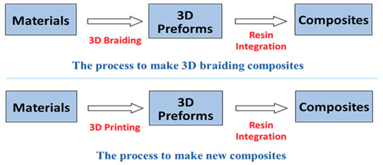The development of additive manufacturing (AM) technology, also known as 3D printing, offers a brand-new method for composite designed and fabrication [4,5,6,7]. In the 3D printing process, the materials can be deposed layer by layer to make parts as long as the CAD model is imported into the 3D printer. The schematic of the 3D printing is shown in Figure 1 [8]. The model is designed in CAD software, and the control codes are then generated layer by layer in slicing software. Finally, the printer can print the parts according to control codes. This means that for the new kind of composite, the 3D braiding structure can be printed out directly and integrated with the resin. Thus, the preform design and fabrication process can be simplified greatly, while saving materials and time. The comparison of the traditional and new processes to fabricate composites is shown in Figure 2 [9,10,11]. However, the mechanical properties of composites with printed preform need further investigation in order to understand their potential applications.