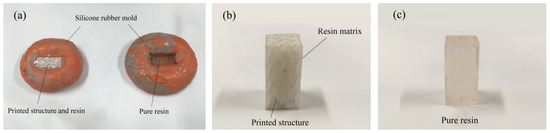 In order to introduce the resin into the printed braiding structure, a rectangular mold was made with silicone rubber, as shown in Figure 4a, so that the printed braiding structure could be put into the mold and immersed in resin. Because of the splendid elasticity of the silicone rubber, after the resin has cured, the composite can be easily taken out of the mold. For the resin curing, the mold with the printed braiding structure and resin needs to be put into the vacuumed oven for 1 h to diminish the bubbles in the resin, or the resin may tend to crack during the curing process and the mechanical properties would be affected in the mechanical test. Subsequently, we adjusted the vacuum oven’s pressure to match the normal atmosphere and heated the sample to cure the resin. The parameters for resin curing are shown in Table 3. The resin needs to be cured under ordinary pressure; otherwise, it may crack and have bubbles in it after being cured.