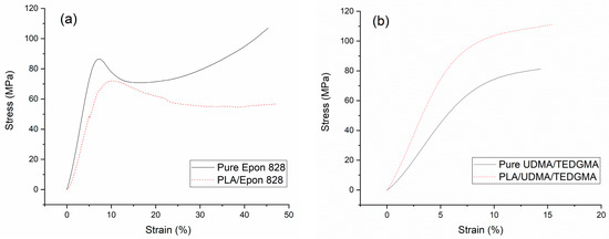 It seems that the PLA printed braiding structure cannot change the main trend of strain-stress curves of pure resins, but may change the compressive properties, such as initial modulus and ultimate stress. As shown in Figure 5a,b, the PLA printed braiding structure decreased the compressive properties of Epon 828 and improved the compressive properties of the UDMA/TEGDMA resin.
