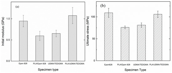 Type 1 (Pure Epon 828) specimen had higher compressive properties than did Type 2 (PLA/Epon 828) specimen, such as initial modulus and ultimate stress, as shown in Figure 6a,b. Compared with Type 1 specimen, Type 2 specimen’s initial modulus went down by 37.03%, from 0.948 GPa to 0.597 GPa, and ultimate stress went down by 30.39%, from 109.226 MPa to 76.032 MPa. On the contrary, compared with Type 3 specimen, Type 4 specimen’s initial modulus and ultimate stress went up by 64.93% (from 0.653 GPa to 1.077 GPa) and 32.84% (from 81.246 MPa to 107.925 MPa), respectively.