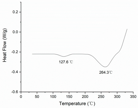 In order to test the curing conditions of the UDMA/TEGDMA resin and dismiss the effect of the resin’s uncompleted conversion, a differential scanning calorimeter (DSC) measurement was utilized. The DSC Q20 (TA instruments, New Castle, DE, USA) was used for this measurement, the increasing rate of temperature was 10 K per minute, and the specimen was the cured UDMA/TEGDMA resin. The DSC curve is shown in Figure 8.