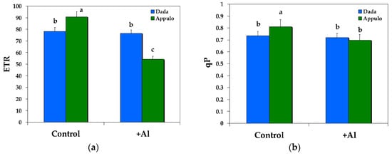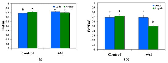 3.4. The Maximum PSII Quantum Efficiency (Fv/Fm) and PSII Maximum Efficiency in Light (Fv’/Fm’) under Normal Growth and Al3+ Exposure