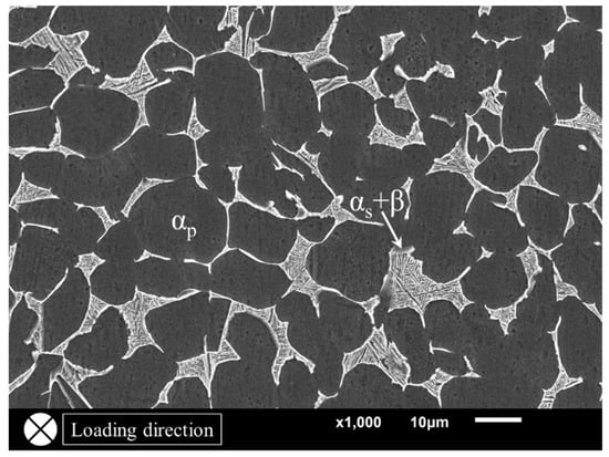 A near-alpha titanium alloy (Ti-8Al-1Mo-1V) was employed in this study. The main chemical compositions (mass fraction) of this alloy were 7.79% Al, 0.98% Mo, 1.00% V and the remaining Ti. Moreover, the detected impurity elements contained Fe, C, N, H and O, and their maximal content was just up to 0.06%. The as-received materials are hot-rolled bars; no additional heat treatment was applied. Figure 1 shows the microstructure of the material along the loading direction, that is, the testing surface corresponds to a transversal section of fatigue specimens. It consisted of about 85% equiaxed primary α grain (αp) and the remaining 15% lamellar structure (αs + β), where secondary α laths (αs) are randomly embedded in the β matrix. Therefore, the microstructure is of a duplex pattern.