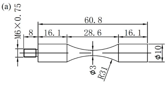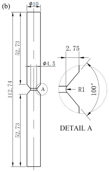 A self-developed ultrasonic fatigue test device was utilized to perform fatigue experiments at various stress ratios. By attaching an ultrasonic fatigue test machine to a conventional uniaxial tensile test machine (Shimadzu AG-X plus), a constant stress is superimposed on the ultrasonic cyclic load. Thus, the variable stress ratio loading was achieved. In order to improve experimental efficiency, a commercial ultrasonic fatigue test machine (USF-2000, Shimadzu, Kyoto, Japan) was used to conduct fatigue tests at R = −1. During fatigue tests, the compressed dry air was used to cool the middle part of specimens. Figure 2 shows the geometries of two kinds of specimens for ultrasonic fatigue experiments. The specimens were designed to work at a resonance frequency of 20 kHz with ultrasonic fatigue machines. The screw was machined at just one end of the specimens at R = −1, while both two ends of the specimens had screws at R > −1. All specimens in this study were machined from the as-received bars with a diameter of 25 mm. Mechanical mirror polishing was performed on the surface of the diameter reduced portion to eliminate scratches. For smooth specimens, only fatigue property at R = −1 was investigated, while three stress ratios of −1, 0.1 and 0.5 were chosen to study the fatigue properties of the notched specimens. Moreover, the elastic stress concentration factor (Kt) of the notched specimen was calculated as 1.82 by finite element method.