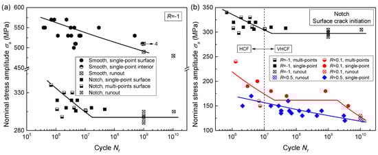 When R = −1, the true stress range at the surface rim region, calculated by multiplying the nominal stress amplitude by the stress concentration factor, from 105 to 107 cycles, is 674.7–554.2 MPa for the notched specimen, which is significantly greater than the true stress range of 588.0–537.5 MPa for the smooth specimen, especially in relative low fatigue life. Both higher loading stress at the same stress ratio [21] and lower applied stress ratio [26] will cause fatigue crack initiation with multi-points. Thus, the multi-point crack initiation behavior prevailed in notched specimen at R = −1, while this feature was not detected in the smooth specimen at R = −1 and the notched specimen at R = 0.5, as shown in Figure 3. With increase in the fatigue life, the transition of fatigue failure mode from multi-point crack initiation to single-point crack initiation will occur [14]. This feature is consistent with the results presented in Figure 3b. Almost all specimens with multi-point crack initiation failed in the low fatigue life regime (HCF). Therefore, only HCF properties are affected by multi-point crack initiation behavior.