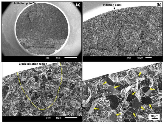 The SEM photographs shown in Figure 5 are an example of the typical fractography of single-point surface crack initiation. For titanium alloys, the facet morphology is discovered frequently in the crack origin region, especially in positive stress ratios [7,8,10,28]. A large number of studies [8,17,26,29,30] have shown that the formation of facets results from the planar slips or cleavages of αp grains, as shown in Figure 1. The critical microstructure resulting in crack initiation is the preferred micro-texture of αp grains for this alloy [26]. The formation of facets and their coalescence process constitute the whole crack initiation stage [8,19]. Thus, by utilizing the facets presented in Figure 5d, the crack initiation region can be recognized completely by the dashed line, as depicted in Figure 5c. The shape of the dashed line totally depends on the distribution of facets; they were of irregular shape in most cases. The projected area normal to the applied stress direction of the single-point surface crack initiation region (area) was measured by this method from their SEM photographs. It should be noted that the facet feature in crack initiation region is blurry at R = −1, as shown in Figure 6. The compression and friction among upper and lower crack surfaces possibly lead to the occurrence of this morphology when pressure is applied. Hence, to ensure accuracy of measurement, only the values of area at positive stress ratios were measured. Finally, the equivalent sizes (