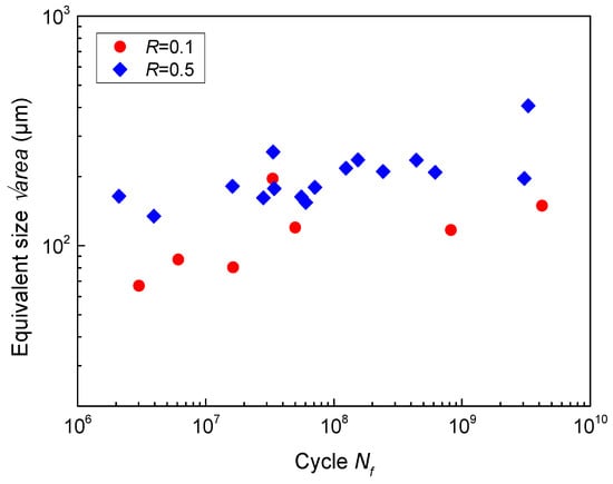 Because the ΔK at the tip of the crack initiation region corresponds to the threshold value of fatigue crack propagation. Higher fatigue life and stress ratio means lower applied stress amplitude (Δσ), as shown in Figure 3b. Thus, in order to remain constant for the threshold value of fatigue crack propagation [6], the equivalent sizes increased with the increase of fatigue life and stress ratio, according to Equation (2).