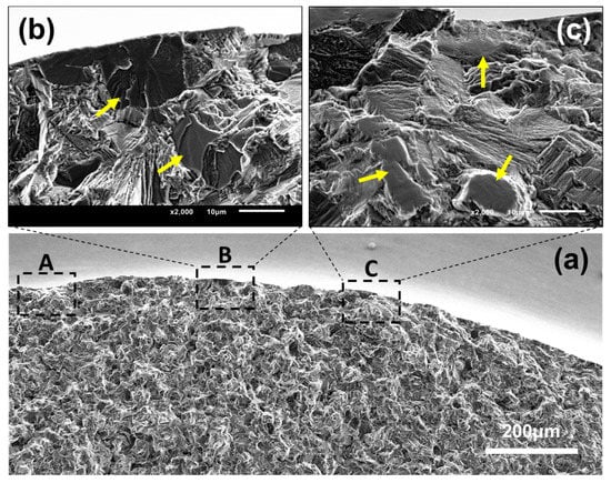 Another typical fractography of multi-point surface crack initiation with three origin sites is presented in Figure 8. The obvious radial ridges, formed during crack propagation, were observed in the vicinity of all three origin sites. This indicates that all three origin sites belong to effective crack initiation points. That is, after these micro-cracks initiate, they grow together and subsequently coalesce with each other. As seen in Figure 3, the multi-point crack initiation behavior was not detected for the smooth specimens, while it prevailed in the notched specimens at R = −1. Meanwhile, with the increase of stress ratio, the number of specimens with multi-point surface crack initiation decreased rapidly. Almost all of the multi-point surface crack initiation failure appeared in the HCF regime (<107 cycles). Similar to the morphology of the single-point surface crack initiation region, facets were detected in the crack initiation region of this failure mode, as shown in Figure 8b,c.