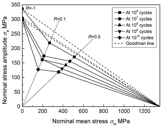 The Haigh diagram is usually utilized to represent the effect of mean stress on fatigue property [34]. It presents the relationship between mean stress (σm) and stress amplitude (σa) at a given fatigue life. On the basis of the fatigue strength data listed in Table 1, the Haigh diagram for the notched specimen in HCF and VHCF regimes is plotted in Figure 9. Goodman approximations are also shown by the dashed lines for comparison, which present a linear relationship between the fatigue strength expressed by stress amplitude at R = −1 (σa,R=−1) and ultimate tensile strength (σUTS):