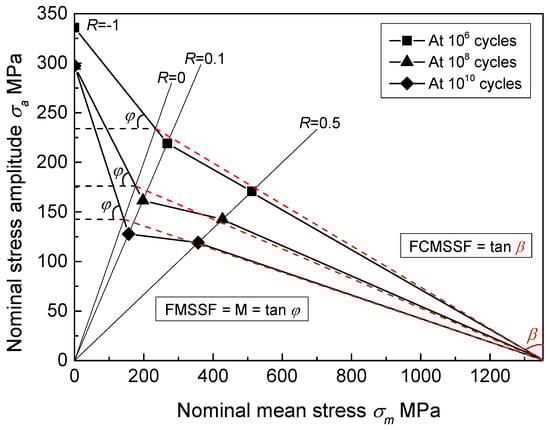 To quantify the mean stress sensitivity of fatigue strength, Mayer [36] proposed a linear method for spring steel. According to Figure 9, a linear relationship is not suitable for calculating mean stress sensitivity for this titanium alloy. Therefore, based on the results in Figure 9 and Goodman method, a bilinear model was proposed. With the increase of stress ratio from −1 to 1, the dominance of fatigue on specimen failure is weaker, while the effect of cyclic creep on specimen failure gets stronger [7,26,37]. At the surface of notched specimens, the true value of applied maximum stress at R = 0.5 exceeded 873.6 MPa by linear elastic theory, which is slightly greater than the yield strength of 820 MPa. This demonstrates that plastic deformation occurred at the surface of notched specimens at R = 0.5; thus, the cyclic creep effect must be taken into account at high stress ratios. Based on the above discussion, the mid-value of R = 0 (σa = σm) was chosen as the inflection point of the bilinear model, as illustrated in Figure 10. When stress ratio varies from −1 to 0, the fatigue mean stress sensitivity factor (FMSSF) is defined as: