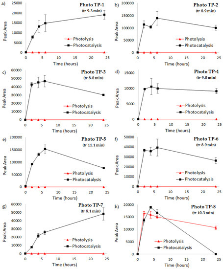 From plotting the time profiles of the identified Photo TPs (Figure 3), it is evident that Photo TP-1, TP-2, TP-3, TP-4, TP-5, and TP-6 are formed only during the photocatalytic treatment in the presence of HApTi, with an intensity that significantly increased during the first hours of treatment (Figure 3a–f).