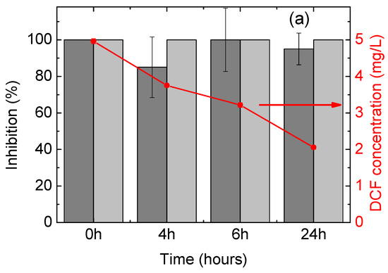 Figure 5 shows the evolution of the acute toxicity on D. magna during photodegradation experiments. DCF solutions (5 mg/L) at the beginning of the experiments exhibit high toxicity on D. magna (100% inhibition). It can be seen that the toxicity of the water samples obtained from the photolysis experiment (i.e., no catalyst, Figure 5a) did not vary significantly and remained very high after 24 h of UV irradiation; similar results were observed for a 48-h exposition. When the photocatalyst was employed (Figure 5b), however, the toxicity drastically decreased after 4 h (15% inhibition) and completely disappeared at the end of the experiment (24 h).
