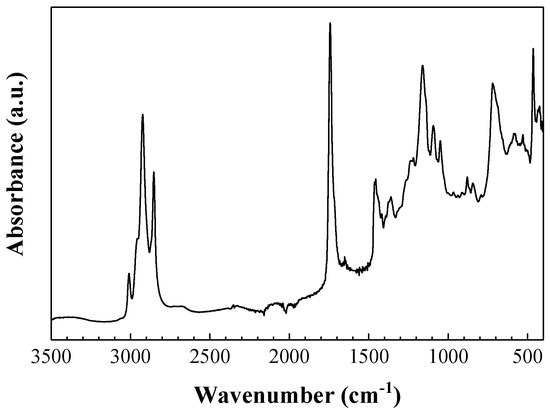 ATR-FTIR spectra were acquired to investigate the Mo15S19–linseed oil interaction. In the spectra depicted in Figure 2, absorption bands characteristic of linseed oil [30] appeared at 2923 cm−1 (H-C-H asymmetric) and 2853 cm−1 (H-C-H symmetric); 3010 cm−1 (C=C-H asymmetric stretching); 1742 cm−1 (C=O stretching); 1459–1456 cm−1 (asymmetric CH3 bending); 1240, 1164, and 1095 cm−1 (characteristic triglyceride ester triplet); and 720 cm−1 ((CH2)n rocking/cis-(C-H)=CH wagging).