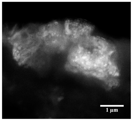 The morphology analysis of the synthesized Mo15S19 revealed the presence of few-micron-size aggregates, such as the one depicted in Figure 4. These would result from the tendency of unmodified nanoparticles to settle down after a finite time if the oil is kept stationary, a behavior that can be minimized by using surfactant-modified nanoparticles [33].
