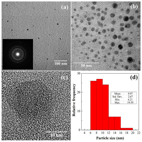 The selected area electron diffraction (SAED) pattern (inset in Figure 5a), compatible either with nanoparticles of single-crystalline structure or with a poly-nanocrystalline sample, was not conclusive. Close inspection of TEM images of as-prepared Mo15S19 particles dispersed in methanol (Figure 5a–c) evidenced their nanoscale size, with an average diameter of 10 nm (standard deviation of 2.7 nm, Figure 5d), smaller than the 70 nm diameter reported in Rosentsveig, et al. [35]; than the 50 nm diameter reported in Santillo, et al. [36]; and than the 10–30 nm diameters found by Duphil, et al. [37] for MoS2. Only in the work by Yu, et al. [38], smaller diameters (5 nm) were attained. However, it is worth noting that, according to Kogovšek and Kalin [39], the NPs size and morphology would not significantly affect the coefficient of friction, which would mostly depend on the NPs’ material.