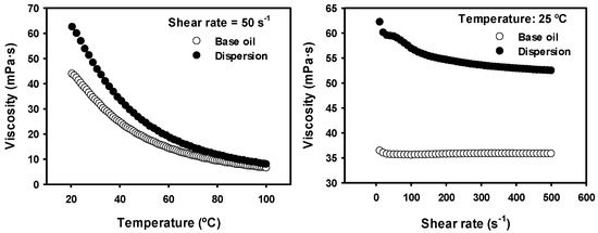 Viscosity measurements of the base linseed oil and of the dispersion of nanoparticles in linseed oil were performed with an AR-G2 rotational rheometer (TA instruments; New Castle, DE, USA), using a plate-on-plate configuration. The shear flow influence on the viscosity was determined at 25 °C by changing the shear rate from 10−2 to 500 s−1. The influence of temperature on viscosity was studied from 25 °C to 100 °C under a constant shear rate of 50 s−1.