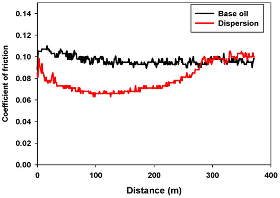 As shown in Table 1, the dispersion was able to reduce the friction coefficient by 23.4% with respect to the base oil. In each test, the friction coefficient was calculated as an average of all the friction values recorded from the entire test duration.