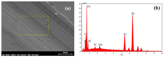 Figure 8a shows an SEM micrograph of the wear track on the surface of the AISI 316L stainless steel disk after lubrication with the base oil, while Figure 8b depicts the results of the energy dispersive x-ray spectrometry (EDX) analysis of the selected area, showing the composition of the stainless steel. The severe wear was the result of plastic deformation, as may be observed on the edges of the wear track, and the result of abrasion, as evidenced by the parallel abrasion grooves along the wear track, parallel to the sliding direction.
