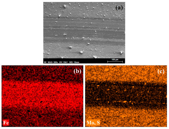 (a) SEM micrograph and (b,c) element maps of the wear track on AISI 316L disk after lubrication with the dispersion of Mo15S19 nanoparticles in linseed oil.