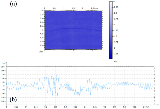 The severity of the surface damage was shown by the surface topography profilometry image of a 3 mm × 2 mm section of the wear track, in which the origin was set on the highest value (Figure 9a). The cross sectional profile of the wear track is shown in Figure 9b. The average total wear volume after three tests was 1.23 × 10−3 mm3 (standard deviation 7.7 × 10−4).