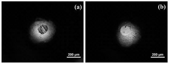 Stainless steel balls also showed wear scars at the end of the tests (Figure 12). In agreement with the different wear mechanisms described for steel disks, the wear scar on the ball after lubrication with base oil showed abrasive wear (Figure 12a), while a smooth circular scar—free from adhered material—was observed after lubrication with the dispersion (Figure 12b).