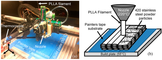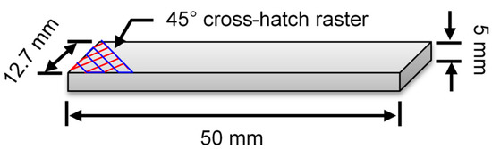 The physical and mechanical properties of PLLA and 420SS are provided in Table 1. The PLLA filament from 3D4MAKERS (Haarlem, The Netherlands) had a natural color and diameter of 1.75 mm. Micro-melt 420LC stainless steel powder from carpenter powder products had a diameter between 45 and 105 µm. A total of 25 layers were printed for each sample at a layer thickness of 0.2 mm, 90% infill density, and a rectilinear infill pattern with a 45° infill angle. At 220 °C, the nozzle temperature was above the glass transition temperature of PLLA and allowed for smooth material flow for deposition. The build plate was heated to 55 °C to promote adhesion with the part. The travel speed of the nozzle was 50 mm·s−1. The dimensions of each sample were 50 mm × 12.7 mm × 5 mm (Figure 2). A brim of 4 mm was also printed to help secure the edges of the part to prevent warping and improve layer adhesion to the build platform.