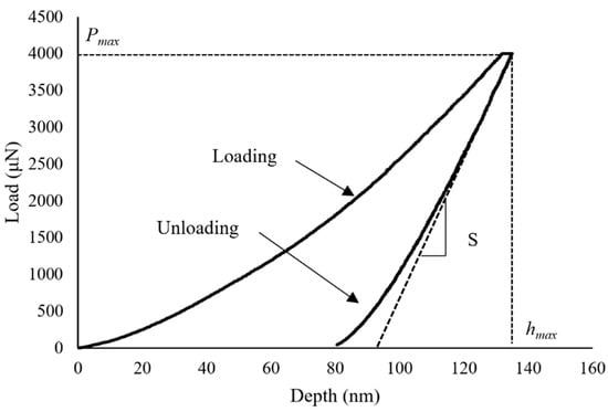 In which, hmax, Pmax, S represent the maximum displacement of the indenter, maximum load, and the slope of the unload curve at the Pmax, which is (, respectively. In addition, ω is 0.75 for the cube corner probe. Based on the contact depth hc and the projected contact area A, the calculated elastic modulus E* is: