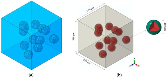 A micromechanical representative volume element (RVE) model was created by using the Digimat software version 4.2.1 (e-Xstream Engineering, Hautcharage, Luxembourg), as shown in Figure 4. Digimat has the capacity to construct microscopic configurations of composite materials and to derive micromechanical material models suited for coupling with FE software ABAQUS (2016). The steel particles were randomly distributed in the PLLA polymer matrix. Steel particle size was defined in accordance with our experimental measurements. The selection of RVE size was based on the following two criteria [29]: