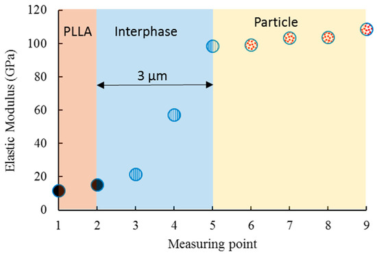 The obtained elastic modulus across three phases of the composite was illustrated in Figure 5. The variation of elastic modulus values from the PLLA toward the steel particle was observable. Hereby, we examined the interface and interphase properties.