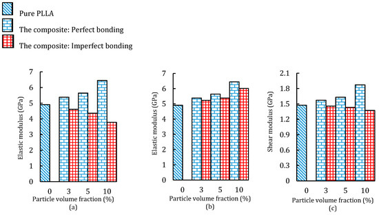 As the particle volume fraction increased to 10%, the effective elastic modulus of the composite increased by 31% (Figure 8a). This enhancement of effective elastic modulus is substantial when compared with our previous work [32] in which the Mg particles enhanced this parameter to 16%. Imperfectly bonded particles exhibited a much smaller elastic modulus, even lower than that for the pure PLLA polymer. This implied the importance of the fabrication process of composites. A comparison of the composite with 10% particles shows that bonding defects can reduce its elastic modulus by 70%, while this difference for PLLA/420SS with 5% and 3% particles is up to 29%, and 17%, respectively. This proves that when degradation of PLLA occurs, the composites with a higher initial elastic modulus will be the weakest ones, which can be accounted as a limitation for embedding a higher volume fraction of particles [35].