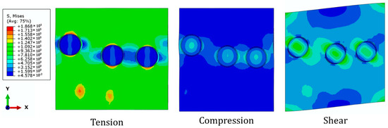The stress distributions of the PLLA/420SS composite with volume fraction of 3% subjected to the loading conditions are depicted in Figure 9. When the specimen is under tension in Y direction, there is a sharp decrease of stress around particles, perpendicular to the loading direction. This could be explained by the reduction of the composite’s integrity. On the other hand, the compression induced a smoother stress distribution among particles. Finally, for the shear deformation in X-Y plane, the debonding effect on the stress distribution was recognizable and decohesion of particles at the angle of 45° and 275° with respect to x-axis was observable.
