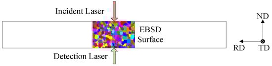 Destructive metallographic observations for samples were then carried out using electron back-scattering diffraction (EBSD) (TSL(EDAX), Mahwah, NJ, USA). The specimens were grinded and electrolytically polished with a finishing solution of 10% perchloric acid, 60% methyl alcohol, and 30% n-butyl alcohol in volume fraction at the current density of 100–150 A·dm−2. The observation step size used during EBSD scanning was 1.5 μm. In order to obtain the information on grains interacting with the ultrasonic pulse, the EBSD observations were made in the RD-ND plane in the region where the ultrasonic pulse propagated through (Figure 1). All the EBSD maps were ≥1.5 mm × 1.5 mm. At least 900 grains in total were measured at different locations for each microstructure. Microstructural information was obtained by using the orientation imaging microscopy (OIM) technique, such as the phase composition of the material, and the crystallographic orientation and area of each crystallite. The mean grain size is calculated as (4/π)0.5 where is the mean grain area.