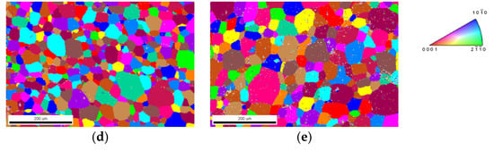 Figure 3 shows the EBSD maps measured for the specimens heat-treated at 800 °C for different holding times. Data for each specimen in the EBSD investigation are presented in Table 1, including the fraction of the α-phase, the mean grain size , the distribution width of grain sizes and the number of sampled grains. Since the specimens are treated below the β-transus temperature, an insignificant number of β-phase crystallites were observed. Despite the fact that grains were deformed by rolling, metallographic observations show that the subsequent annealing treatments after holding for 0.5 h produced an approximately equiaxed crystallite with an aspect ratio of about 0.78.