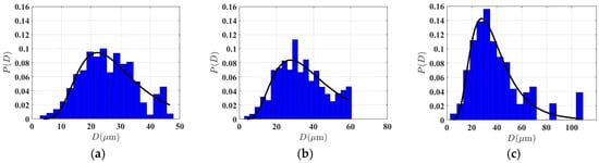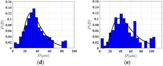 To evaluate the grain-size distribution effects on the ultrasonic response, a careful characterization for the grain-size distribution in each specimen was made. Following a series of studies [,,,,,,,,,,], a log-normal distribution function, which has been shown to closely represent the realistic polycrystalline microstructures, was then used to fit the grain size distribution data by using the Levenberg–Marquardt nonlinear least squares algorithm. According to the fitting model, the logarithm of the size D of each crystallite is normally distributed, i.e., , with and donating the mean and the standard deviation. The probability density function for a log-normal grain size distribution reads as []: