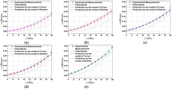 Comparison in attenuation coefficient versus frequency between experimental estimations and two different theoretical models: (i) the Rokhlin’s model [] considering a single mean grain size, and (ii) the improved Turner’s model [] incorporating a log-normal distribution of grain sizes, for a longitudinal wave in α-titanium alloy annealed at 800 °C holding for (a) 0.5 h, (b) 1 h, (c) 2 h, (d) 4 h, and (e) 8 h. The solid curves correspond to fitted results using an approximate power function in Equation (3). (Color online).