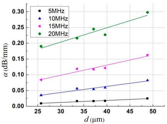 The grain size dependency of attenuation was further studied for the application to nondestructive grain size measurement. According to the power law of attenuation on frequency obtained above, the measured attenuation was used to establish the linear relationship of grain size at the given frequencies of 5, 10, 15, and 20 MHz, and the attenuation data are replotted as a function of grain size in Figure 8. The coefficients of multiple determination of linear fitting were all above 0.932, showing a good fit. The linear dependence of attenuation on grain size was in good agreement with results in the recent literature [,], which can be further used to approximately predict the mean grain size by inversion of laser ultrasonics.