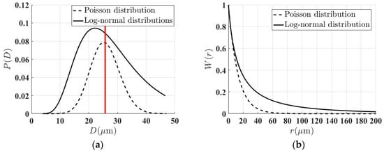 It is seen from Figure 7 that our experimental data was quantitatively larger than the theoretical prediction by the Rokhlin’s model considering a single mean grain size, while it is in reasonable agreement with the one by the Turner’s model incorporating a closely log-normal distribution of grain sizes at all the frequencies. In order to provide a physical interpretation on this phenomenon, the specimen holding for 0.5 h with a mean grain size of = 26 μm is taken as an example, and its fitted model of log-normal size distribution is compared to the Poisson statistics assumed in the Rokhlin’s model in both the probability density function of grain sizes (Figure 9a) and the spatial correlation function (Figure 9b). It is known that the larger grains seem to dominate the attenuation at a given frequency [,]. Indeed, a greater probability of large grains with a log-normal distribution was found compared to the idealized Poisson distribution assumed by Rokhlin, which led to a larger value of spatial correlation function at a given distance r. This maybe explains why a greater attenuation level was observed than the predicted attenuation with a single mean grain size.